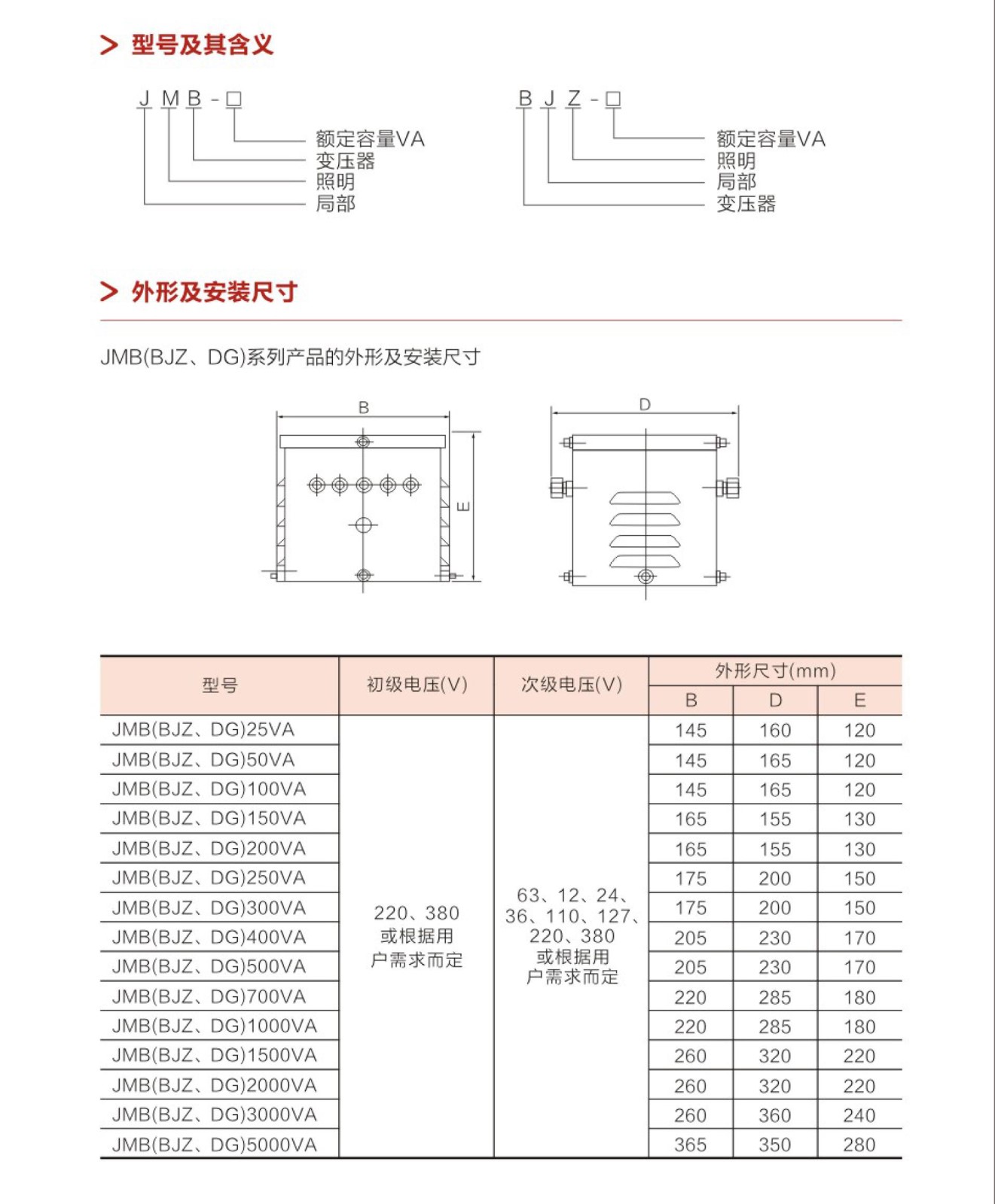 JMB、BJZ、DG、BZ系列行灯照明变压器适用于50~60Hz,电压500V以下的电路中,作为机床及其他设备的局部照明灯电源。